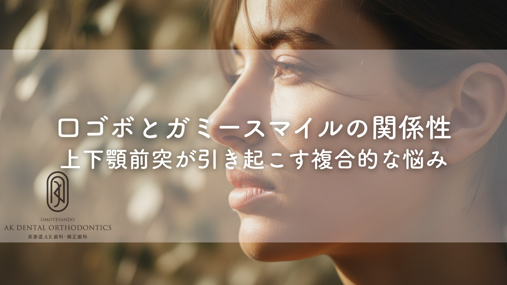 口ゴボとガミースマイルは、実は密接に関係しています。上顎前突によって口元が前方に突出すると、上唇が歯茎を覆いきれなくなり、ガミースマイルを併発するケースが多く見られます。つまり、骨格的な問題が両方の症状を同時に引き起こしているのです。