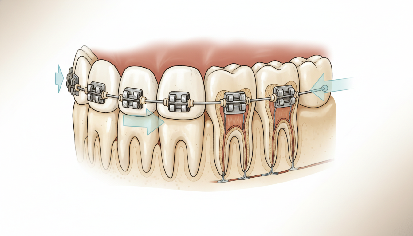ワイヤーは、歯に装着されたブラケットを通して歯に力を伝えます。この力によって、歯の周囲の骨が吸収と添加を繰り返し、歯が少しずつ移動していくのです。